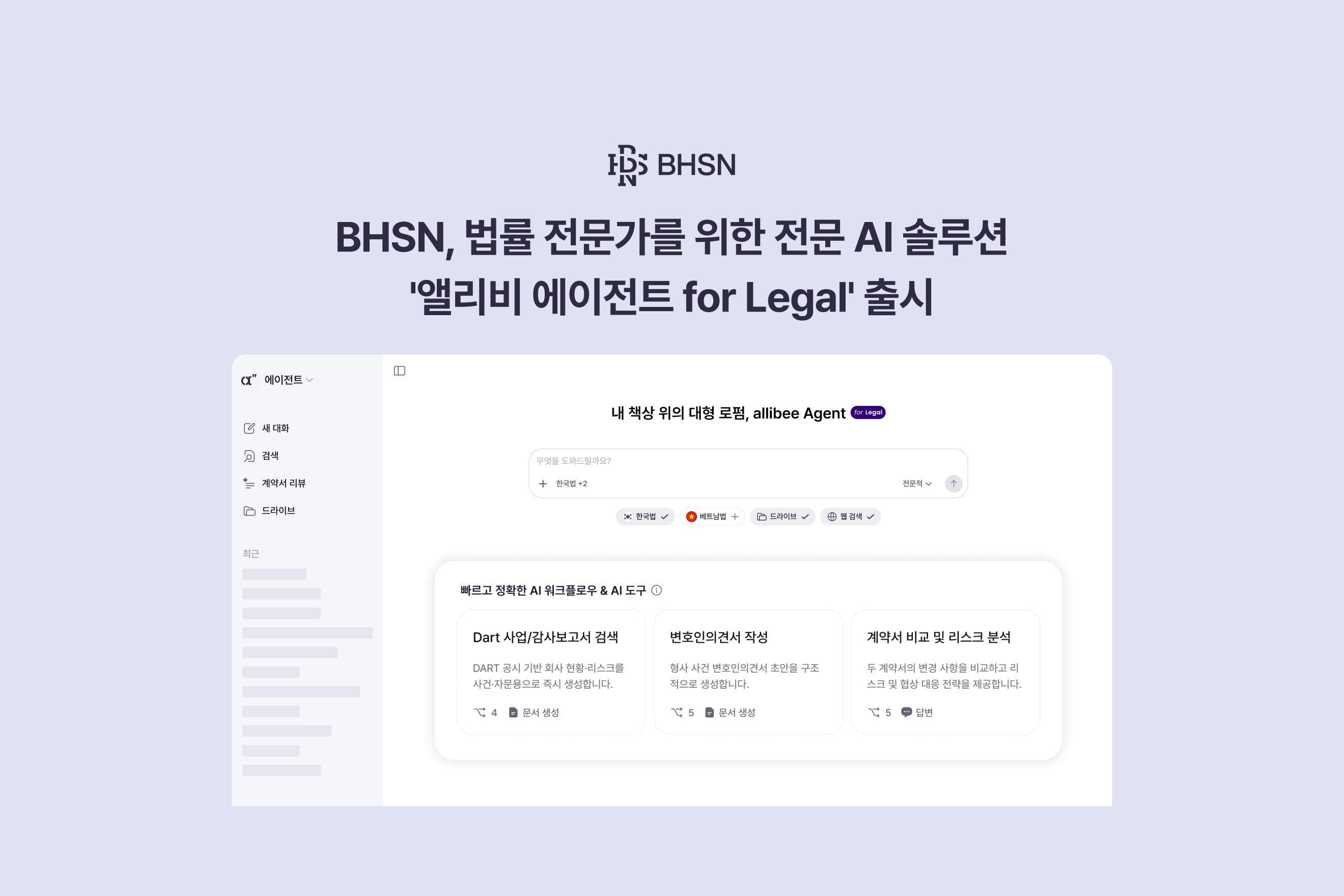 [보도자료] BHSN, 올인원 리걸AI 솔루션 ‘앨리비 에이전트 for Legal’ 정식 출시